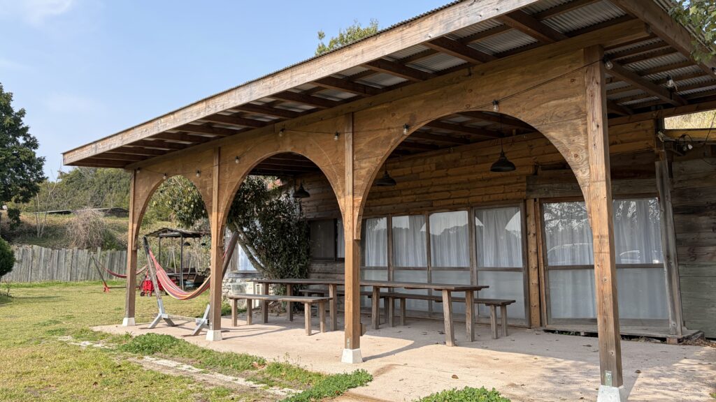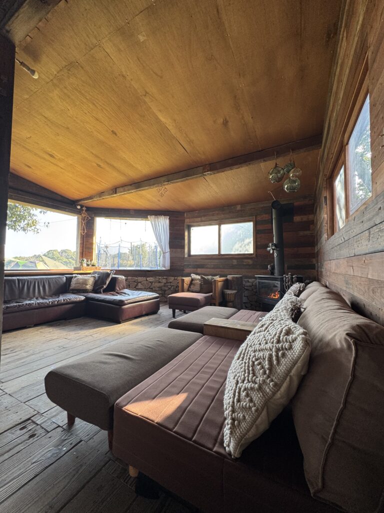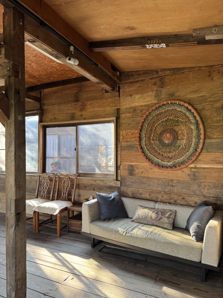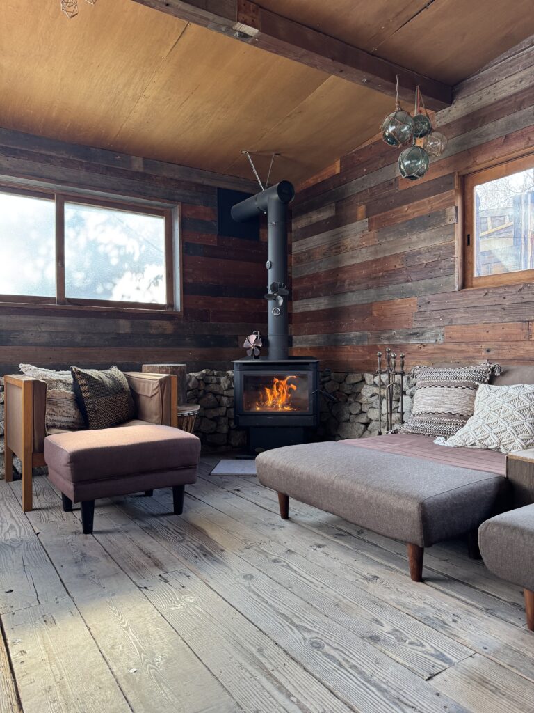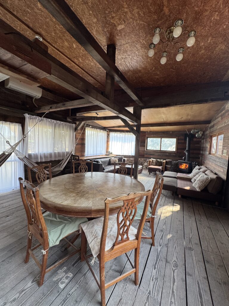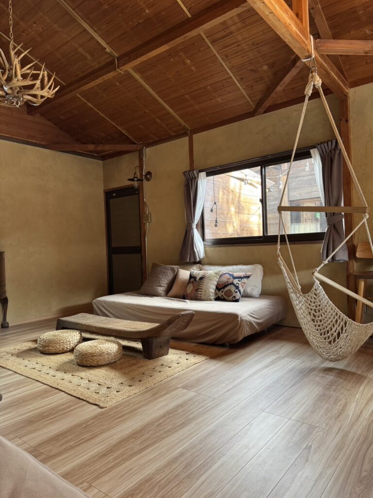 淡路島の自然を全身で感じられるコテージ。自然素材の土壁と木の梁が調和した落ち着きのある空間。